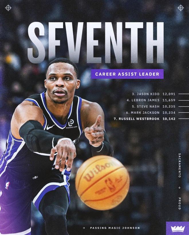 第3、送出本場第2次助攻之時,威少職業(yè)生涯助攻次數(shù)達到10142次,超越魔術師約翰遜獨占歷史第七。